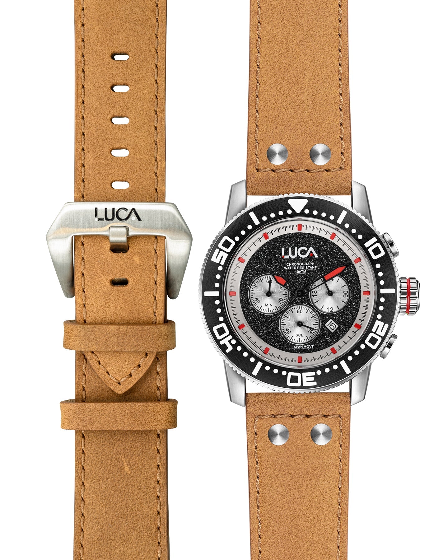 Our brushed-finish BR-1 Chronograph series is a uniquely masculine watch made from the finest quality materials and assembled using modern workmanship and design methods. The BR-1 features a practical, easy-to-read dial with a simple, yet highly functional rotating bezel. Each watch is engraved with a unique serial number on the backplate and is delivered in a beautifully designed, heavy-duty watch box with a plush interior. In the box, you will find a selection of LUCA accessories, as well as the band of your choosing. The LUCA Chronograph is also available in the CH-1 series with a polished finish.